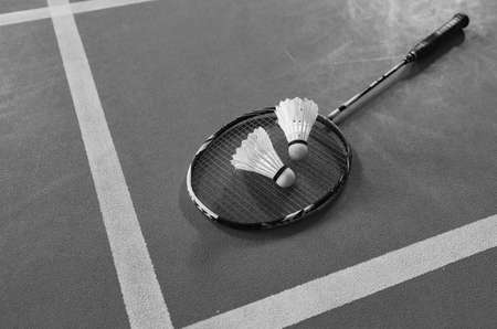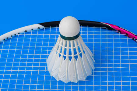 Closeup view of badminton racket and white badminton shuttlecock on badminton court. soft and selective focus on shuttlecock.