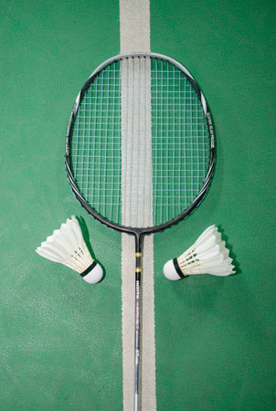 Badminton rackets and white cream badminton shuttlecocks after playing or after games on green floor in indoor badminton court soft focus concept for badminton lovers around the world.