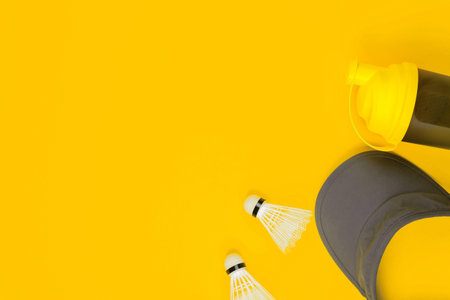 A pair of shuttlecocks next to a yellow water bottle and a tennis hat on yellow background , shot from above.