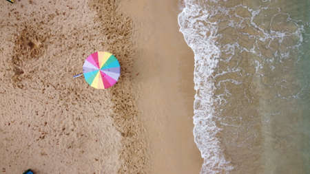 Aerial view of colorful umbrella on sandy beach. Top view.