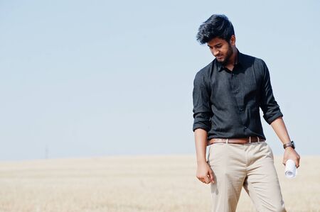 South asian agronomist farmer inspecting wheat field farm. Agriculture production concept.