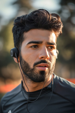 Determined Jogger with Headphones in Outdoor Setting.