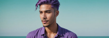 Midshot Portrait Photo Of A Classy Handsome Male Model With A Purple Hair Isolated On A Seagreen Background With Copy Space, Banner Template. Generative AI