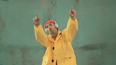 Charismatic Asian man in stylish outfit and haircut stands by a bright orange wall.