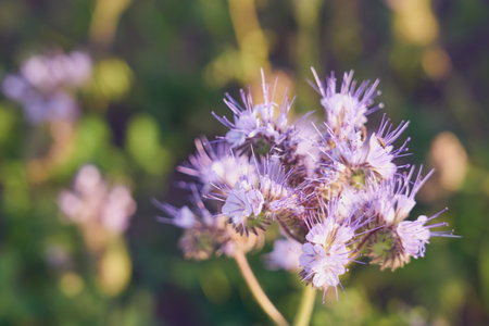 Detail of a purple flower of polemonium caeruleum illuminated by sunlight