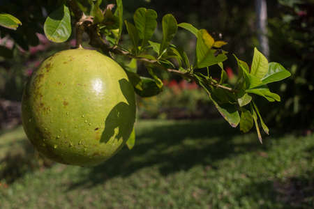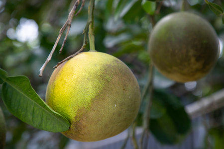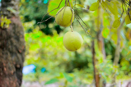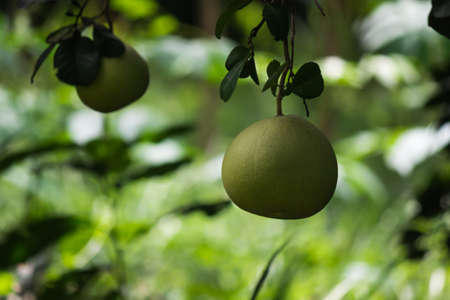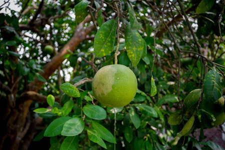 Pomelo fruit hanging on tree branch in the garden, tropical fruit