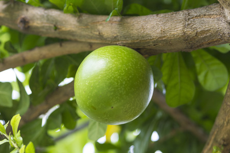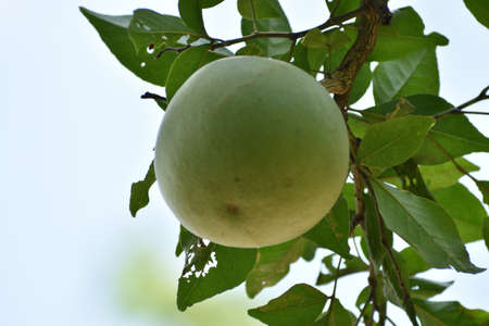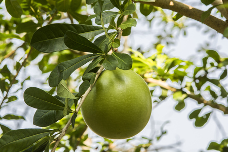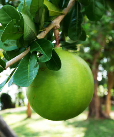 Berenuk crescentia cujete has large round green fruits that grow in tropical forests