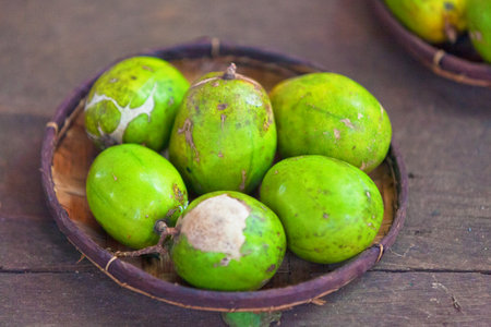 Old,green and yellow,local Indonesian fruit namesKedondong,placed on the brown wooden background