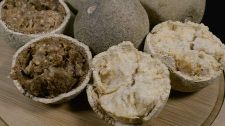Baobab fruit or Adansonia digitata on plate, pulp and powder, superfood on the island of Zanzibar, Tanzania, east Africa. Close up