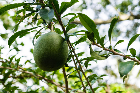 A green Pomelo fruit hanging on the tree. Also call green Grapefruit.