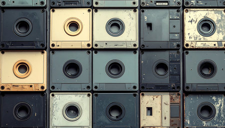 A wall of memories captured on magnetic tape. Each weathered cassette in this vintage collection tells a story of a different era, from 80s rock anthems to personal mixtapes. This retro background evokes a deep sense of nostalgia for the golden age of analog audio and physical media.