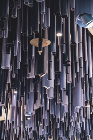 Geometric lines abstract background. Grey and blue cylinder pipes of different diameters. Unusual decorations. Chaotic patterned backdrop.