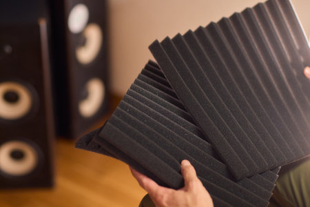 Setting up audio equipment with soundproofing panels in a modern studio environment