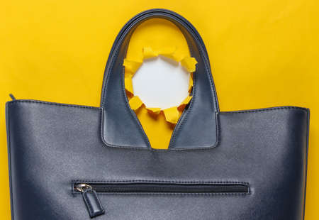 Fashionable leather bag on yellow background with torn hole. Top view