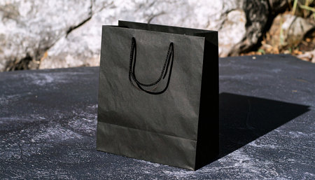 Mock up of black paper bag for fashion shopping on white background, copy space.