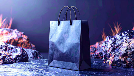 Blank paper bag mockup on concrete floor with shadow overlay. 3D rendering