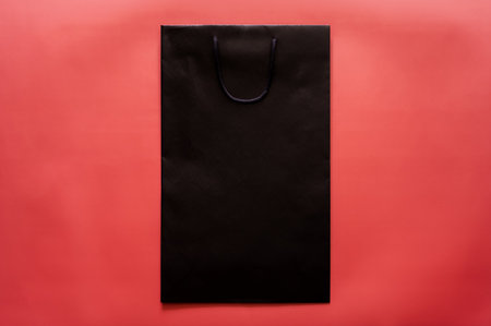Black paper shopping bag on red background with copy space for text. Black Friday sale, shopping concept