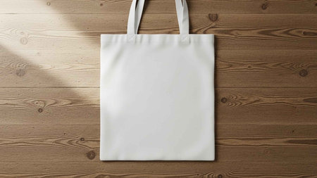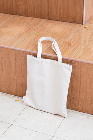 Tote bag canvas fabric cloth shopping sack mockup blank template on wooden background. Stock photo.