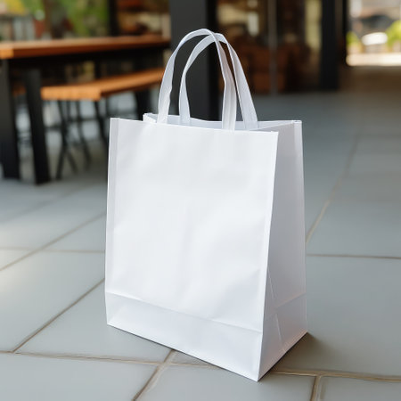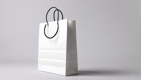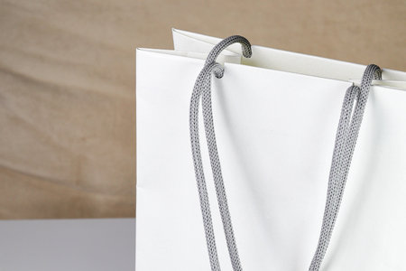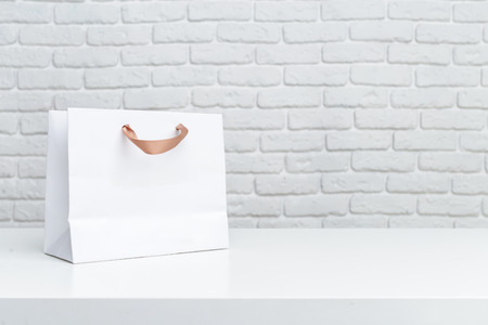 White paper shopping bag, present bag standing on white table with shallow focus.