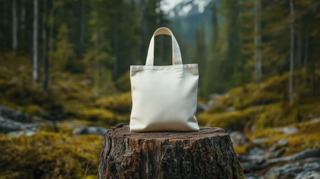White canvas tote bag mockup template with long handles and wild flowers near tree outdoor. Surface to place your design