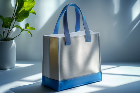A sleek silver and blue handbag rests on a clean white background, illuminated by sunlight shadows, beside a lush green indoor plant.