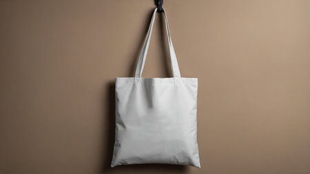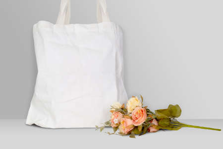 Mockup white tote bag fabric for shopping and flower on desk, mock up canvas bag textile with reusable.