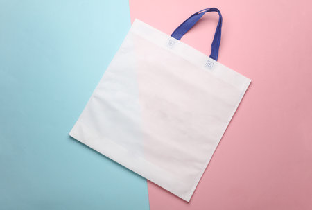 Zero waste concept. Eco friendly reusable textile shopping bag on blue background. Top view with copy space
