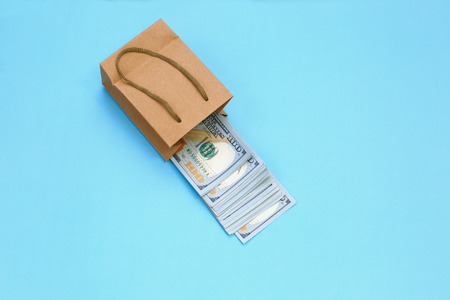 A lot of 100 dollar bills in gift bag on blue background with copy space. Cash gift. Business Present. Shopping concept. Bundle of dollars in present shopping bag. bonus
