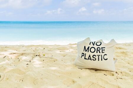 No More Plastic eco bag on sandy tropical beach with blue sea background , copy space