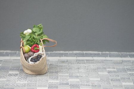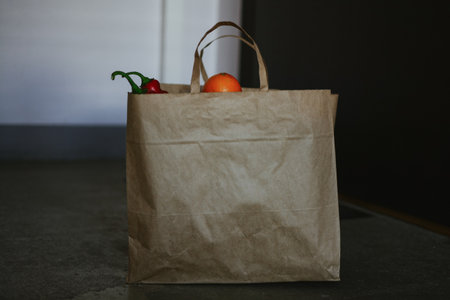 A paper bag with fresh vegetables in the entrance close-up. Order goods from the online store directly to your home via courier using contactless delivery.