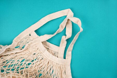 Beige string bag on turquoise background. Market, ecology concept. Top view, flat lay, copy space