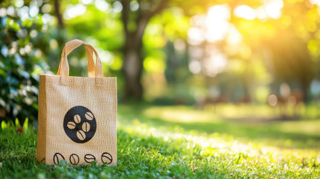 A stylish eco-friendly bag sits gracefully on lush grass in a serene park. Sunlight filters through trees, creating a peaceful atmosphere perfect for outdoor activities.