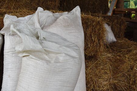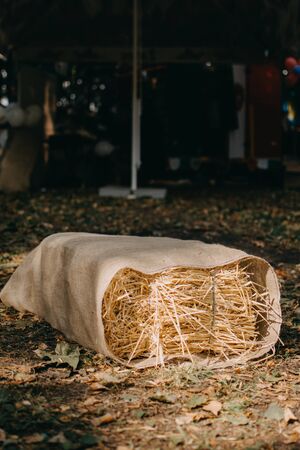 Upcycling ideas, Recycle crafts. Alternative eco-friendly benches made of straw and burlap bales at fair, market outdoor. Furniture made of pallets and straw bales Wedding Hay Bales.