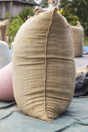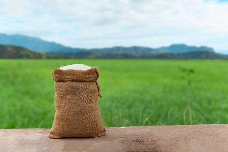 Jasmine Rice in burlap sack on wooden table with the rice field background