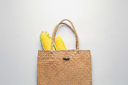 woman is holding straw back for shopping with products without plastic packaging. minimalistic concept
