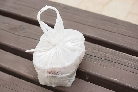 Plastic shipping envelope delivered to customer on concrete floor. Parcel delivery concept