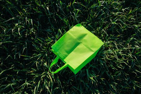 Eco bag. Bag in the green grass. Space for text, flat lay composition.