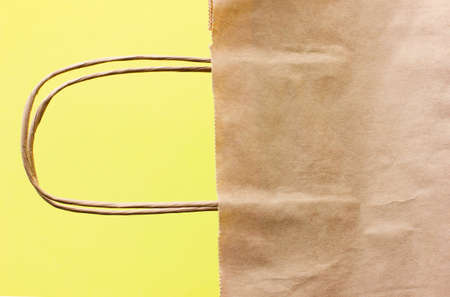 Shopping bag on a bright yellow background, top view. Black friday concept, sale, discount, shopping. copy space