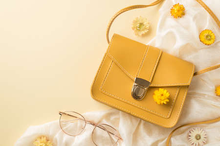 Top view photo of woman's day composition yellow leather purse stylish spectacles white textile and wild flowers on isolated beige background with blank space