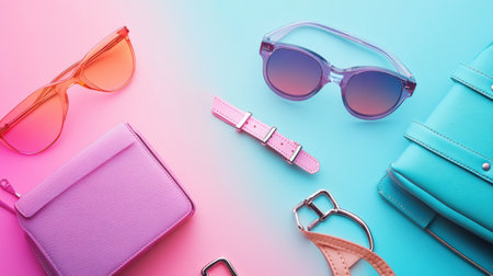 Fashion accessories like sunglasses, belts, and purses are artfully arranged in a flat lay against a smooth gradient background, showing vibrant colors.