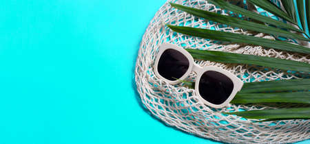 Sunglasses with mesh bag on blue background. Enjoy holiday concept. Copy space