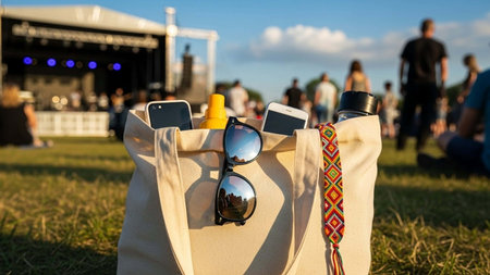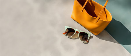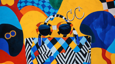 Bright and colorful arrangement featuring a stylish handbag and sunglasses against an abstract background, perfect for fashion and lifestyle themes.