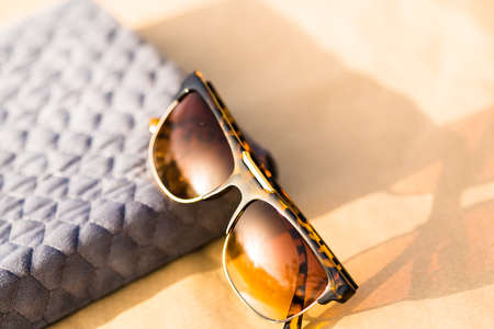 Classic sunglasses model with brown lenses and print frame shoot in a summer day closeup . Selective focus