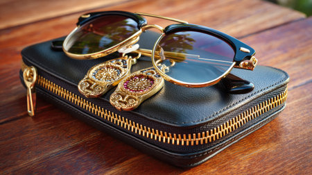 A chic composition featuring modern sunglasses with gold accents placed elegantly atop a sleek black zippered case, complemented by striking earrings.