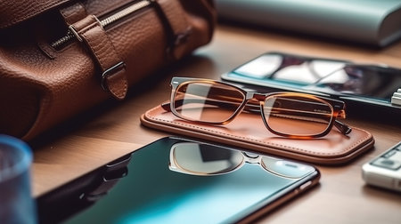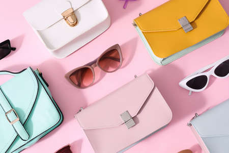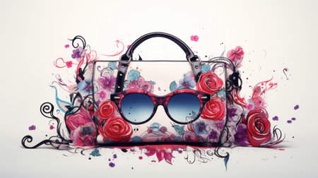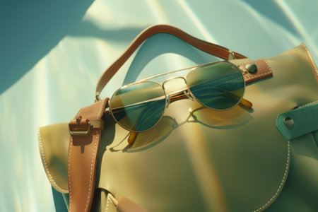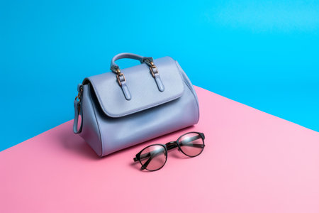 A stylish and trendy composition of a lady's handbag and glasses on a colorful background. The composition exudes a sense of elegance and fashion. Generative AI Technology.