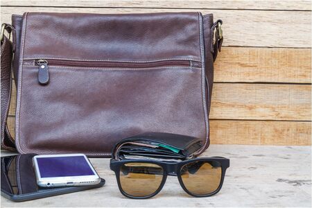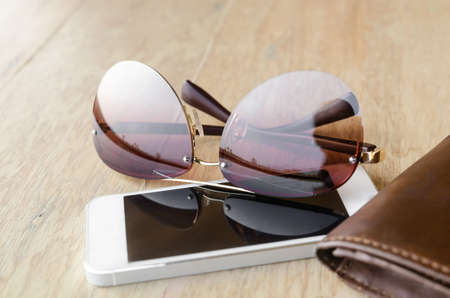 a set of tinted sunglasses and smartphone, leather wallet on wooden background-with selective focus