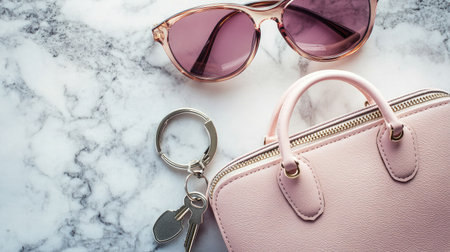 A fashionable pink handbag rests elegantly alongside chic sunglasses and a keychain on a stunning marble surface, showcasing modern style and aesthetics.