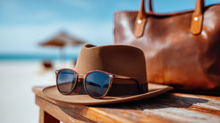 Close up on a brown felt hat and dark-lensed sunglasses placed on a textured wooden surface, with a large brown leather tote bag standing just behind them, set against a brightly lit, shallow depth of field background featuring white sand and blue ocean under a clear sky, suggesting preparation for or pause during a warm weather outing.
