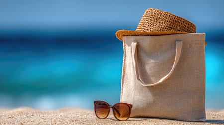 Beach bag with sunglasses and hat on the beach. Vacation concept