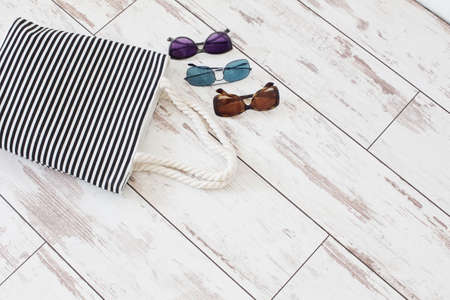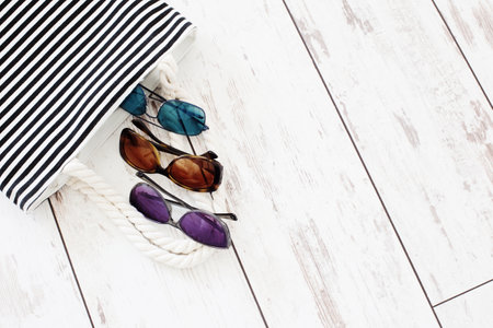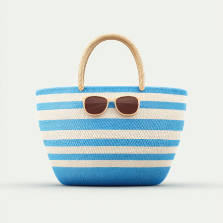 A chic blue and white striped beach bag paired with stylish sunglasses, perfect for summer outings. Ideal for vacations, trips to the beach, or casual strolls.
